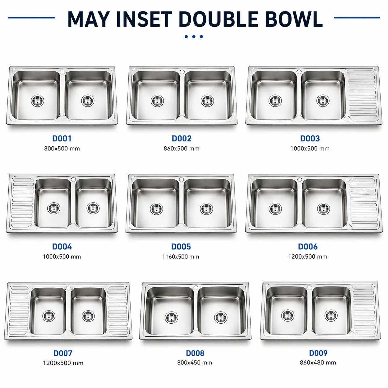 Collection of MAY double bowl inset sinks designed for functionality, durability and efficient kitchen workflows.